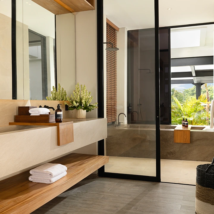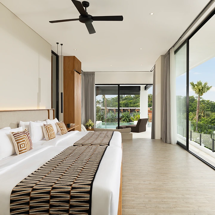 Step into the beautifully designed Arita Villa, where every detail reflects the principles of Japanese design—simplicity, harmony, and natural beauty. The villa features six thoughtfully designed bedrooms, each offering a private and serene retreat for guests. On the upper floor, the master bedroom features twin king-sized beds with direct views of the garden, creating a tranquil atmosphere. Its expansive ensuite bathroom is equipped with luxurious amenities, including a bathtub and shower.