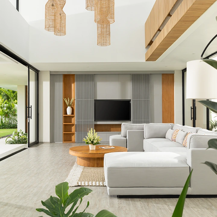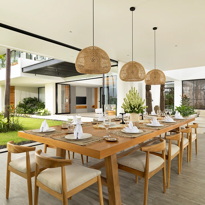Arita Villa living spaces are designed to blend comfort and beauty, with a layout that encourages a connection to nature. The living room features high ceilings, large windows, and minimalist Japanese-inspired decor, seamlessly integrating indoor and outdoor living. The spacious dining area seats up to twelve guests, providing an elegant setting for shared meals. The fully equipped kitchen includes modern appliances and clean, natural tones, making it easy to prepare and enjoy culinary delights with family and friends.